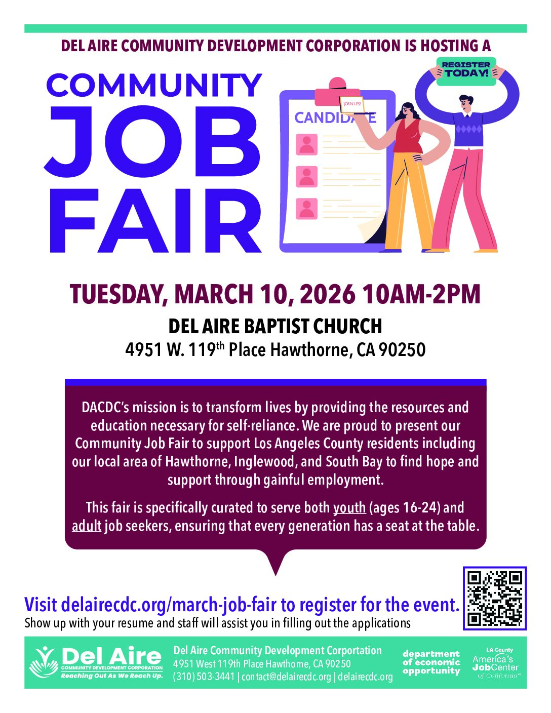 Are you ready to take the next step in your career? The Del Aire Community Development Corporation (DACDC) is proud to host a Youth & Adult Community Job Fair. This event is designed to connect residents of Los Angeles County with career opportunities. Whether you are a young person looking for your first job or an adult seeking a new career path, this event is for you!